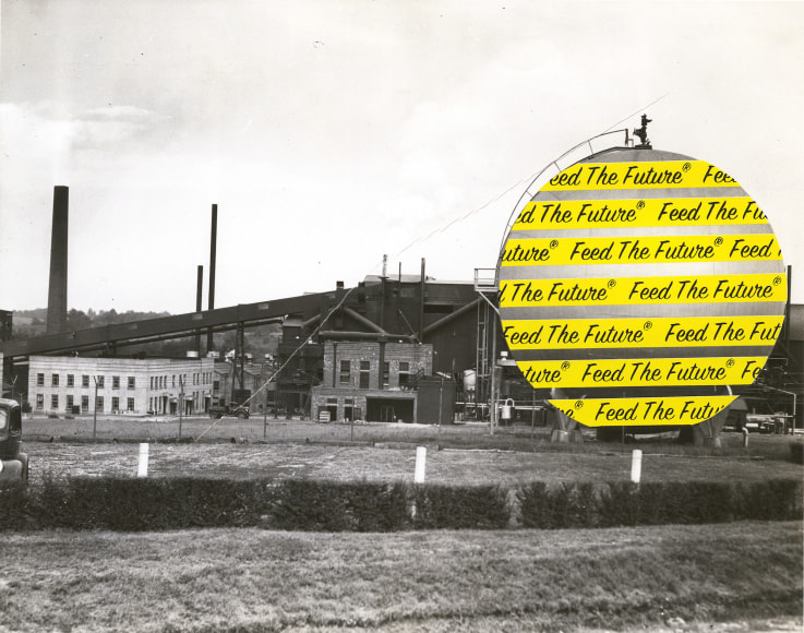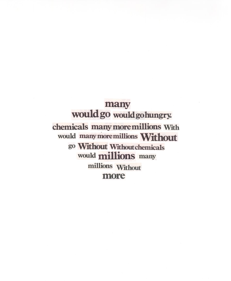 Tracey Morgan Gallery is pleased to present What Goes on Here, a solo exhibition of works on paper by Asheville based artist, Kirsten Stolle. The exhibition features three series: Chemical Bouquet, By the Ton, and Faith, Hope, & $5,000. A reception for the artist will be held on Friday, December 1st, from 6-8 p.m. Stolle’s carefully composed collages and text-based works examine the influence of agribusiness and biotech companies on our food supply. Mining source materials such as 20th century medical books, agricultural equipment catalogs, and archival photographs, Stolle’s evocative work responds to corporate propaganda and challenges industry narratives. Drawing on 19th century floral still life paintings, Stolle’s Chemical Bouquet collages comment on the use of harmful herbicides and the genetic modification of plants by global chemical corporations. Victorian flower bouquets have been subverted and populated with odd, unsettling imagery⎯all elements associated with Monsanto Chemical Company products. Bloated cow udders, syringes, 18-20th century medicinal and botanical plants (corn, soy, rapeseed, cotton), and aspirin pills and bottles overflow from vases wrapped in Agent Orange barrels. Stolle’s striking, large-scale ornately framed works offer a considered critique of chemical intensive farming practices. Using collage, silkscreen, vintage postcards and archival photographs, By the Ton spotlights the practice of corporate greenwashing and exposes the troubling history of the agrichemical industry. Stolle extracts words and phrases from chemical company advertising, superimposing text over historical photographs. These sparse works, layered with multiple meanings, reframe and recontextualize corporate messaging. In the debut of her new series, Faith, Hope, & $5,000, Stolle draws on the history of found poetry and manipulates both typography and graphic elements to create non-narrative poems. Using the appendix extracted from a mid-1970’s corporate history of Monsanto Chemical Company, Stolle reassembles each page to explore found text in a visual format. The final sixteen-piece installation made up of excised and pasted chemical names, alludes to the interplay of image and text, and gives new unexpected content to the original material. Born in Newton, Massachusetts in 1967, Stolle relocated to Asheville after 19 years in the San Francisco Bay Area. Her work is included in the permanent collections of the San Jose Museum of Art, (San Jose, CA), Crocker Art Museum, (Sacramento, CA), and the Minneapolis Institute of Art, (Minneapolis, MN). Select solo exhibitions include NOME Projects (Berlin), Southeastern Center for Contemporary Art (NC), and the Turchin Center for Visual Arts (NC). Her work has been published in numerous publications including Made in Mind Magazine, Poetry Magazine, Spolia Literary Magazine and New American Paintings. She is a recipient of a PollockKrasner Foundation Grant, a Dave Bown Project Award, as well as grants from the San Francisco Arts Commission, Artists’ Fellowship Inc., Puffin Foundation, Change Inc., and the Creative Capacity Fund.